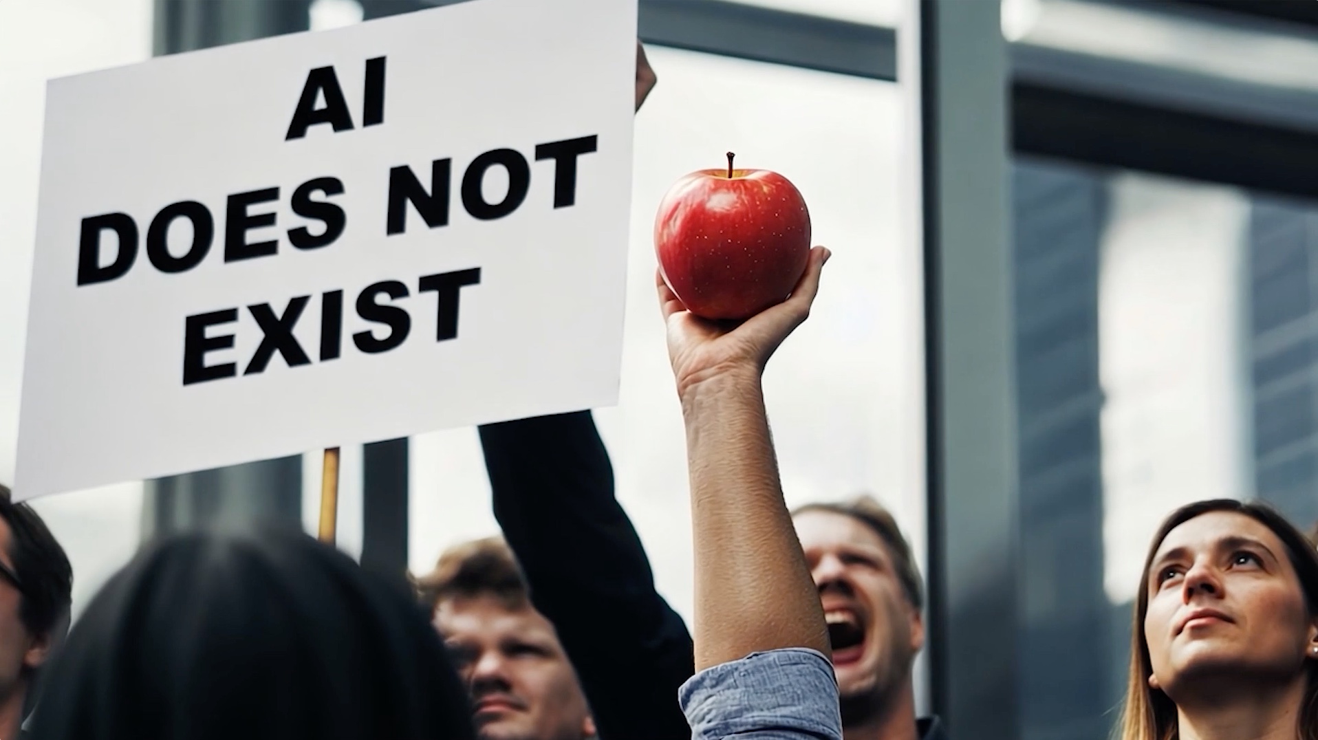 Protesters hold up empty signs in various locations, then the world around their struggle gradually disappears. The signs demand a return to reality: I am real, We are real, We are in reality, Everything is real.