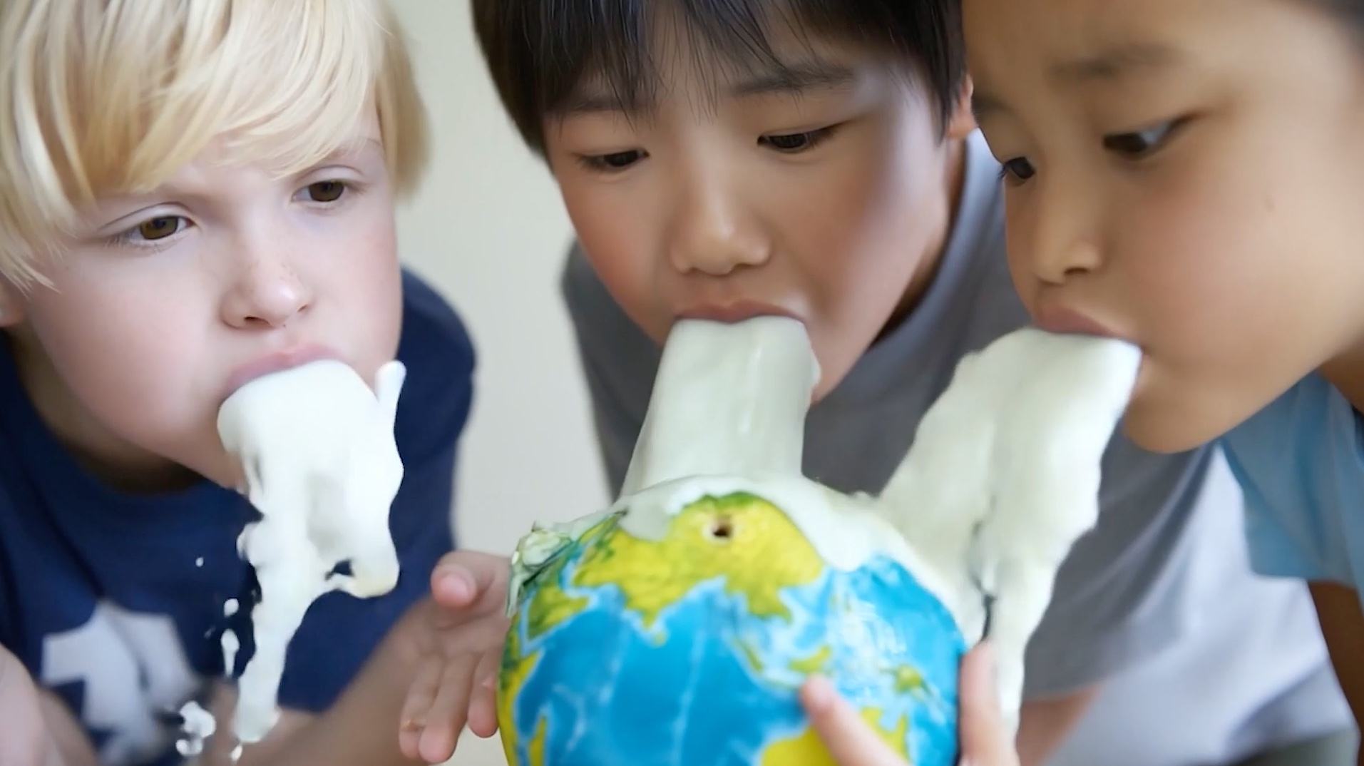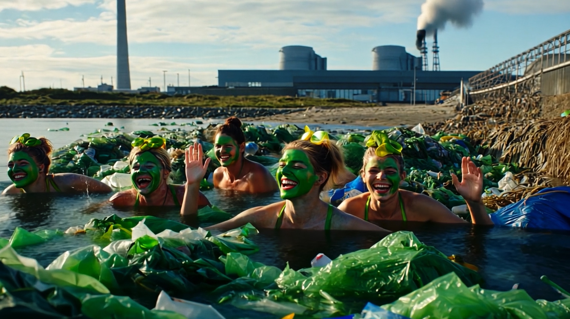 Volunteers clean pollution from toxic sites until even the sand on the beaches turns green. The Earth becomes an object held in the hand, protected and cherished, only to be discarded on a mountain of waste.