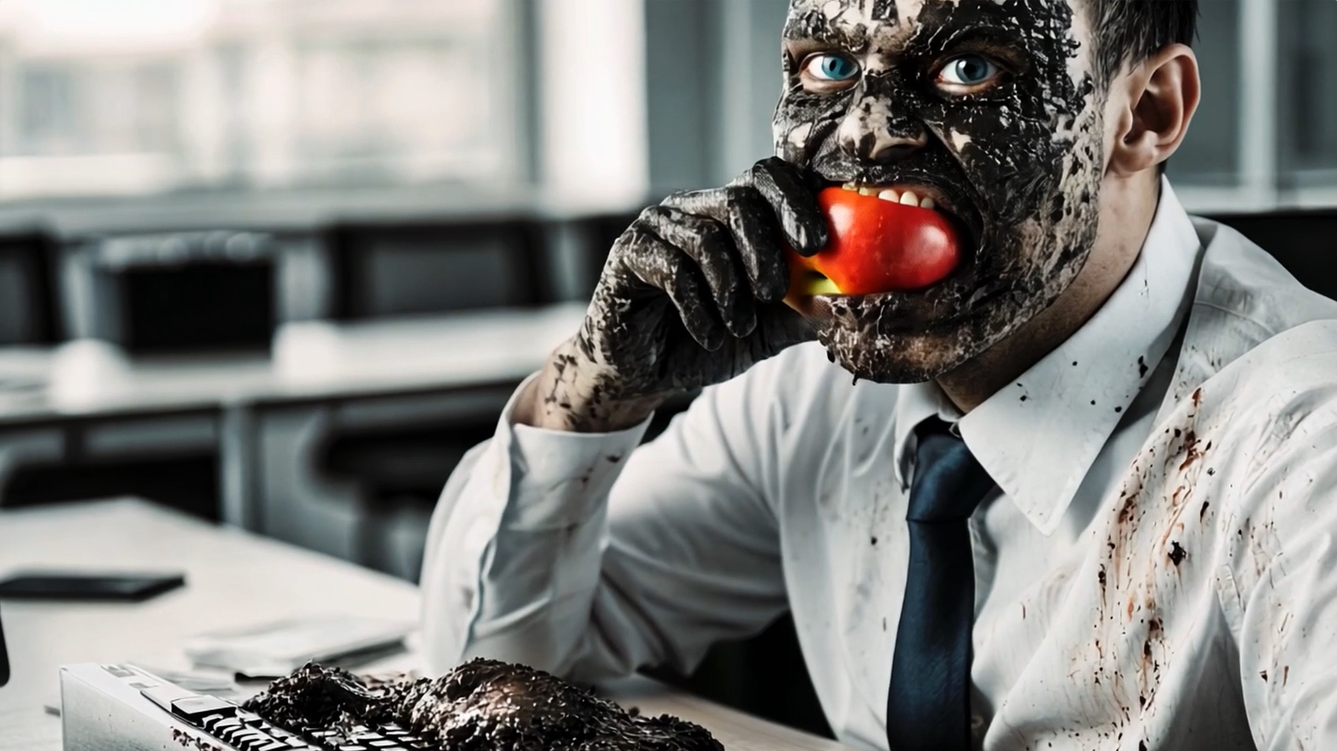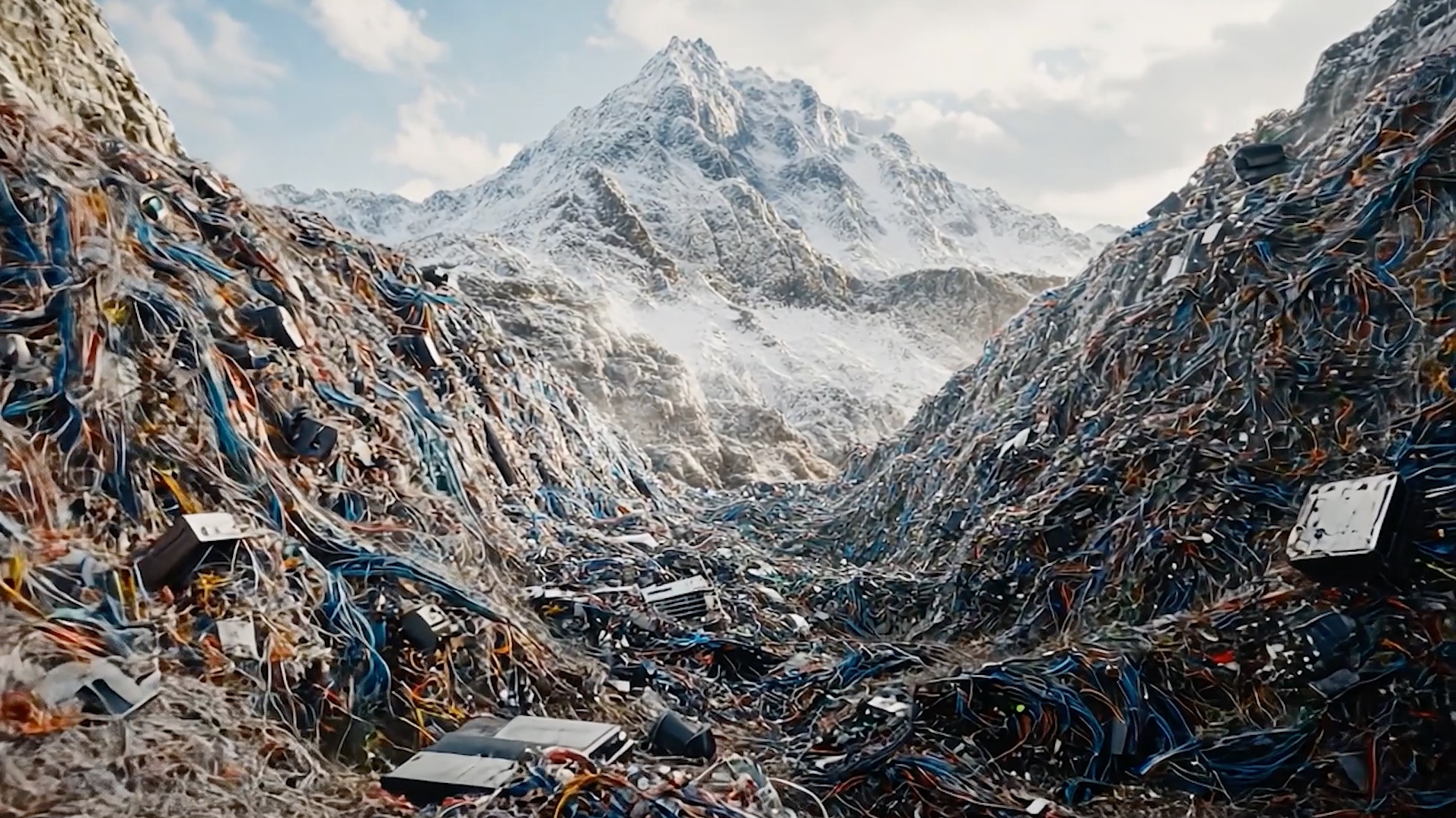 We had already assembled a corpus of the most widespread stock image tropes.25 We then recreated each of these images using the most common generators. Everything is Real thus shows the reddest apples, the greenest call centers, the most wired server rooms, the most efficient volunteers, and the largest mountains of waste. But by looping these stereotypes, the images gradually tip into the extreme. The red apple, alone on a white background, appears in the hands of employees who smile a little too much, then gorge themselves until they sink into their own juice ☛ Juice.